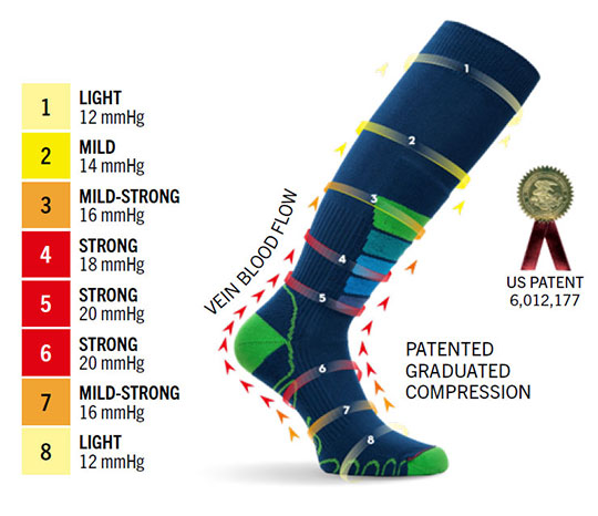 This strategically tiered knit construction stimulates blood flow to the feet and legs to prevent swelling, retain warmth and help offset deep vein thrombosis (DVT). Maximized oxygen delivery to muscles reduces fatigue, soreness and lactic acid build-up to eliminate cramping. The fit is secure support with freedom of movement to energize any experience.