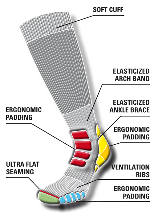 » ERGONOMIC PADDING in key areas matches your sport or lifestyle choice. The padding is consistently thick in the impact zones for exceptional cushioning, with bevels at the ends that transfer smoothly into the sock. We knit the padding from low to high densities, and place them in a channel pattern to increase ventilation and moisture management without bulk, wrinkling or restriction of movement. (Not available in Ultra Lightweight styles.)