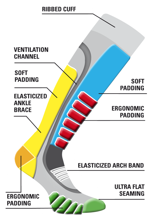 Used in all EUROSOCKS™ , the Elasticized Ankle Brace is made with specialized Spandex knits combined with sport specific Technical Fibers. This feature guarantees a perfect, wrinkle free fit around the ankle, supports the Achilles tendon and increases comfort.